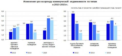 В 2015 году наибольший прирост цен составил на аренду помещений под банковские филиалы 6%, ресторанов - 5,2%, промышленных баз - 5,1%. Цены на аренду автомоек снизились на 3,2%, подземных паркингов - на 0,8%, киосков - на 0,1%.