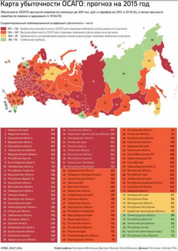 «Эксперт РА» прогнозирует, что в 2015 году страховщики получат убытки по ОСАГО в 69 регионах. По их оценке, в 2013 году деятельность страховщиков по ОСАГО была убыточной в 23 регионах. В четырех регионах — Камчатском крае, Амурской, Ульяновской и Мурманской областях — убыточность превышает 120% (то есть компания тратит на бизнес по продаже полисов ОСАГО на 20% больше, чем собирает в виде премии). В 2015 году, по прогнозу «Эксперт РА», таких регионов будет уже 43.