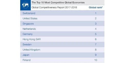 Всемирный экономический форум опубликовал рейтинг самых конкурентоспособных стран мира. В тройку лидеров вошли Швейцария, США и Сингапур, сообщает NUR.KZ со ссылкой на сайт ВЭФ.