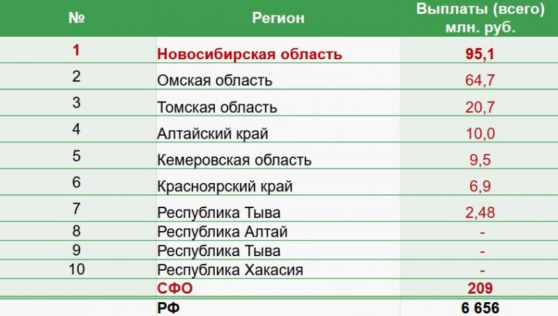 По показателю выплат в агростраховании Новосибирская область заняла первое место среди регионов СФО. На второй строчке расположилась Омская область (64,7 млн руб.), за которой следуют Томская область (20,7 млн руб.), Алтайский край (10 млн руб.), а замыкает топ-5 Кузбасс (9,5 млн руб.).