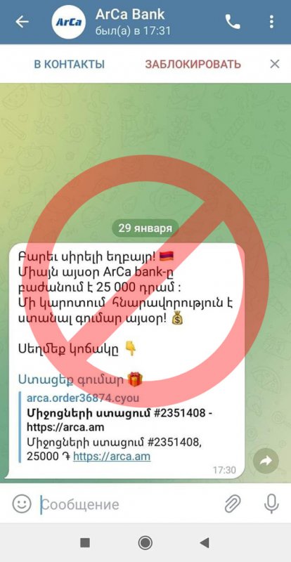 "По этим ссылкам предлагается заполнить карточные данные (номер, срок действия, CVV и PIN-коды) с различными обоснованиями, например, для получения денег. Призываем в случае получения таких ссылкой сохранять максимальную бдительность, удостовериться в истинности страницы. Ни в коем случае не предоставляйте третьим лицам и не вносите свои карточные данные и получаемые через SMS одноразовые коды на неизвестные сайты и страницы непонятного происхождения", - предупреждают в ArCa. --0--