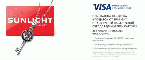 До 31 декабря 2017 года совершите покупку в SUNLIGHT картой Visa, Visa GOLD или Visa Platinum Банка «Легион», назовите кодовое слово VISA_SUNLIGHT и получите в подарок изысканную подвеску SUNLIGHT и 1500 рублей на бонусный счет.